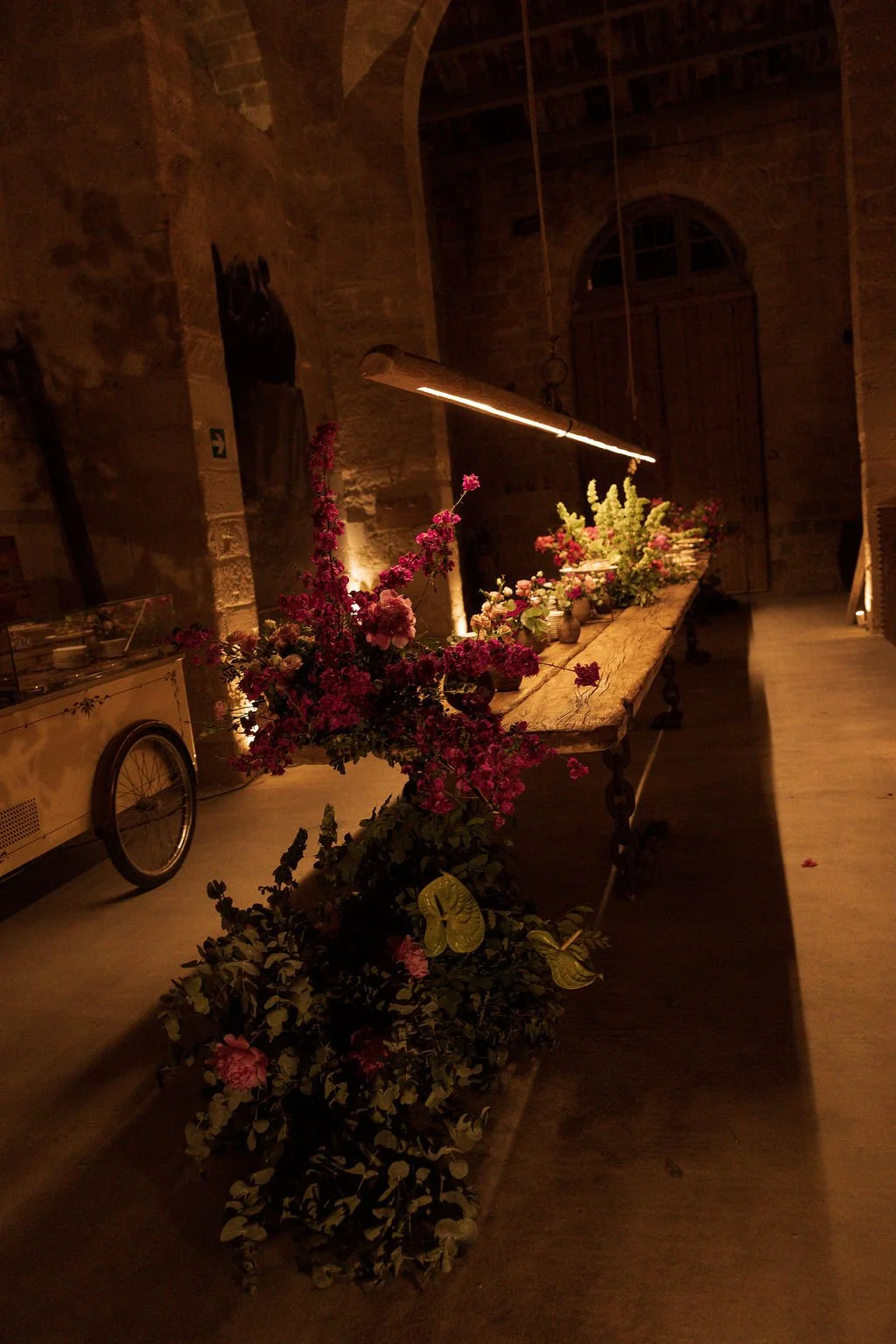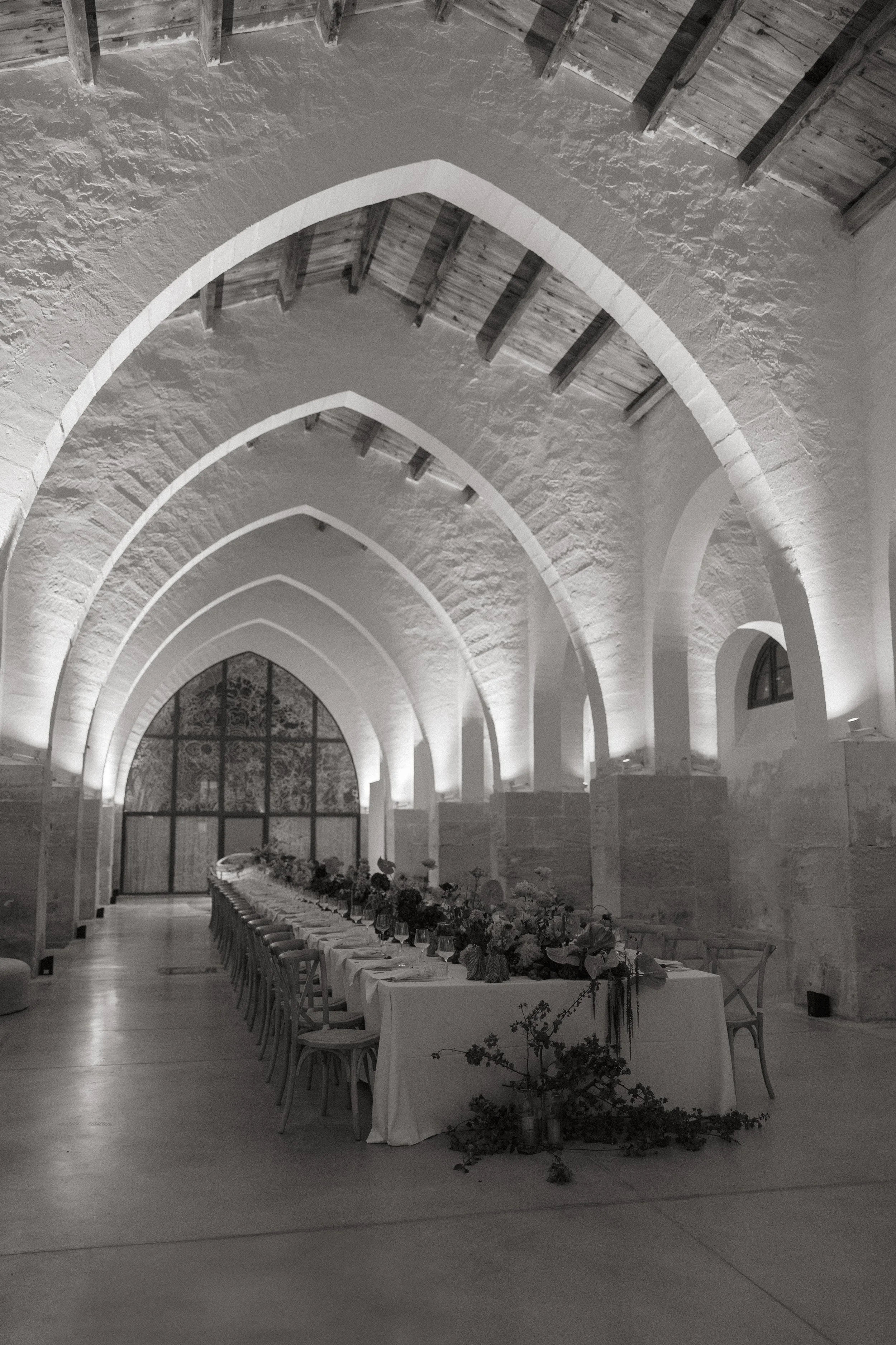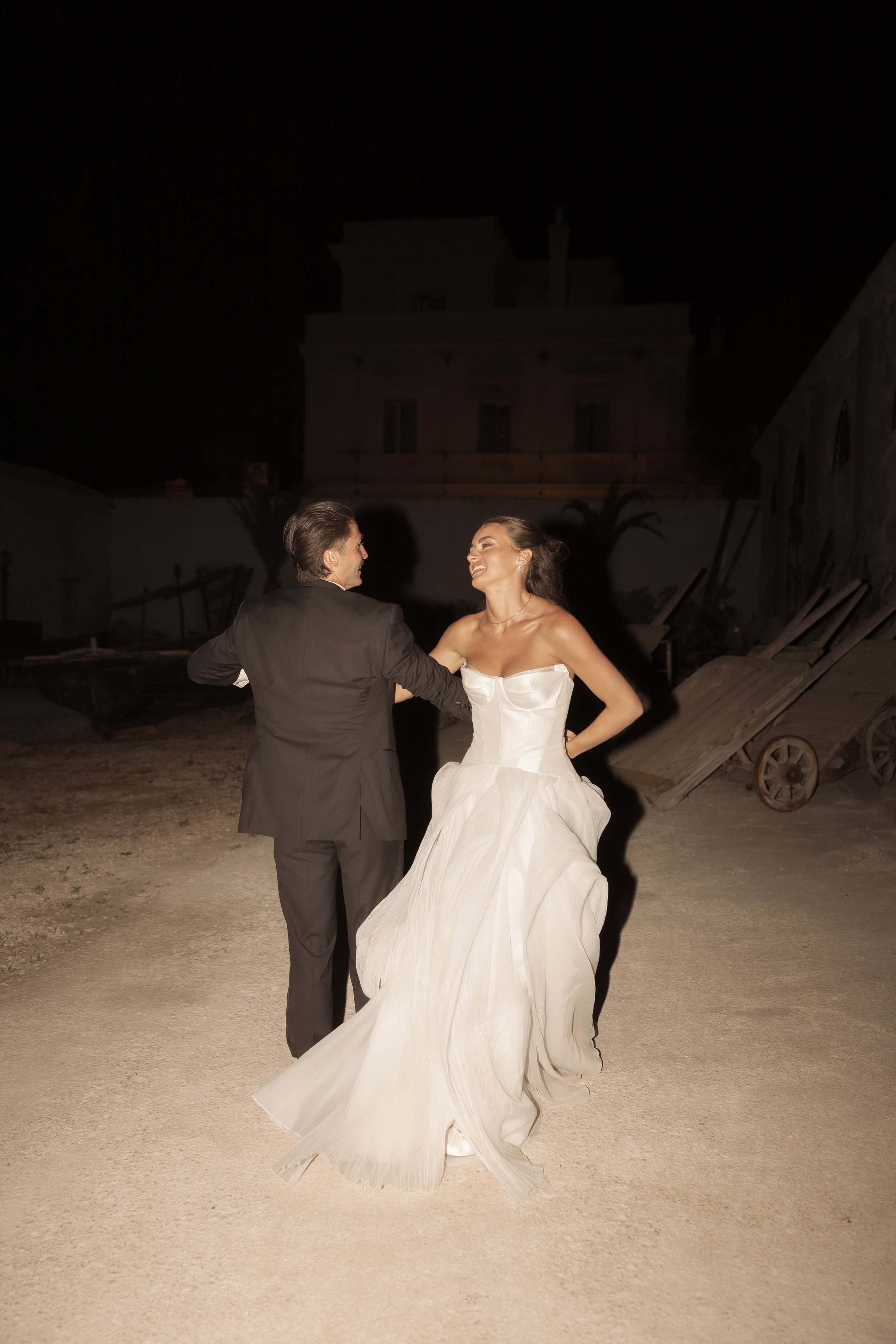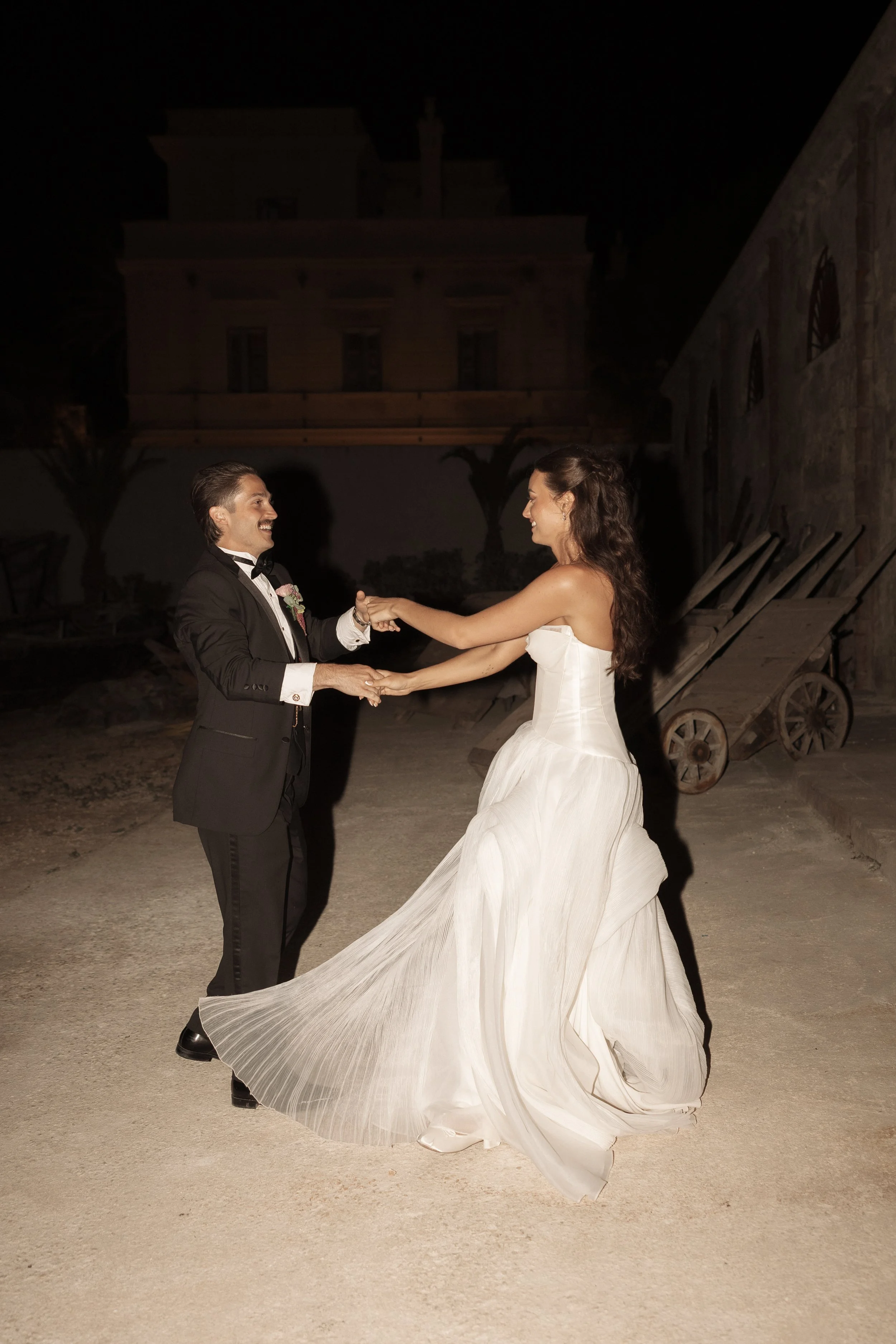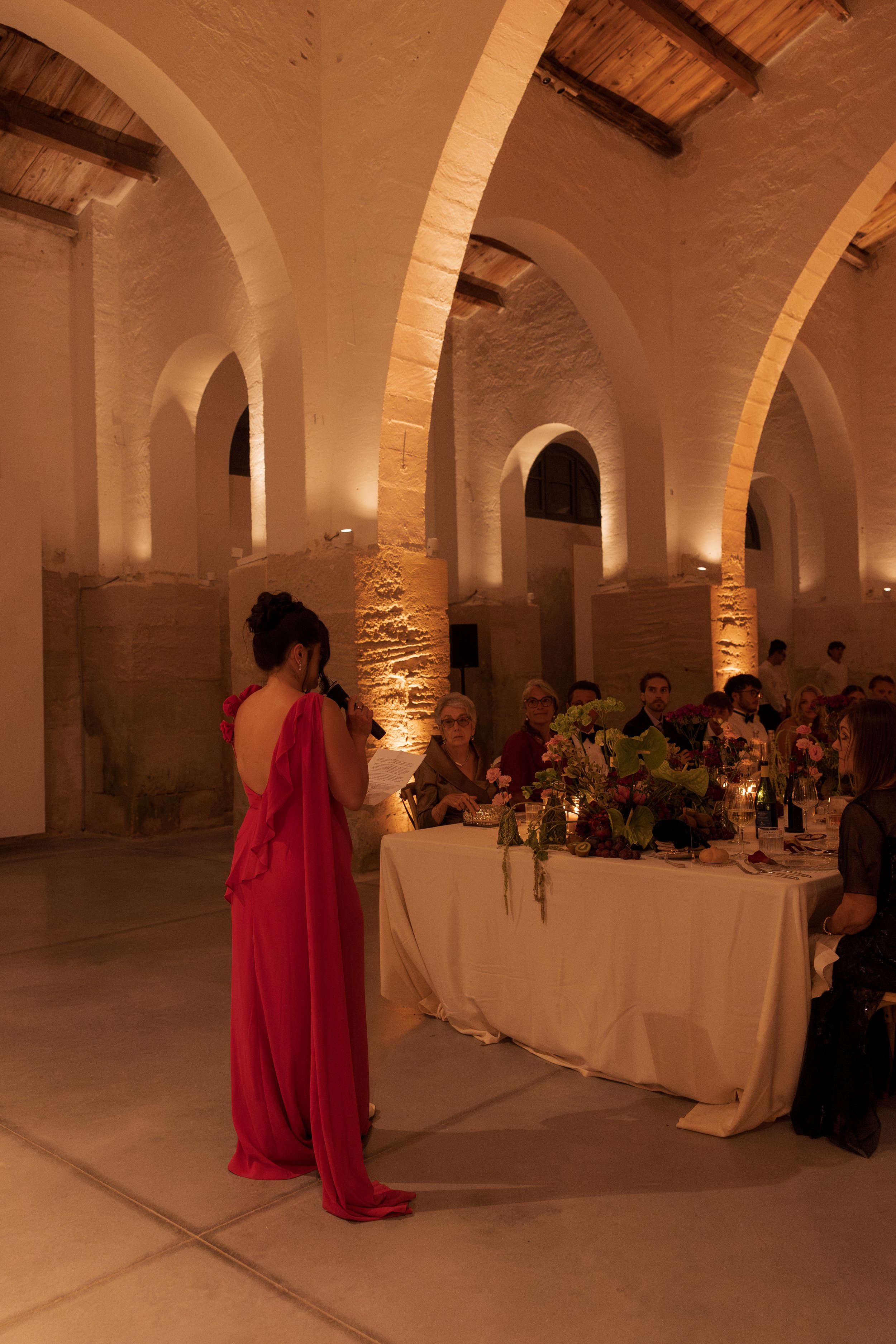 Their reception took place underneath the arches of one of Sicily’s most cinematic and impressive wedding venues. An unforgettable family dinner stretched across one long table layered with hundreds of colorful flowers and fruit, candles and warm ambient lighting, making this one of the most romantic wedding celebrations I’ve ever photographed. It all felt incredibly alive.